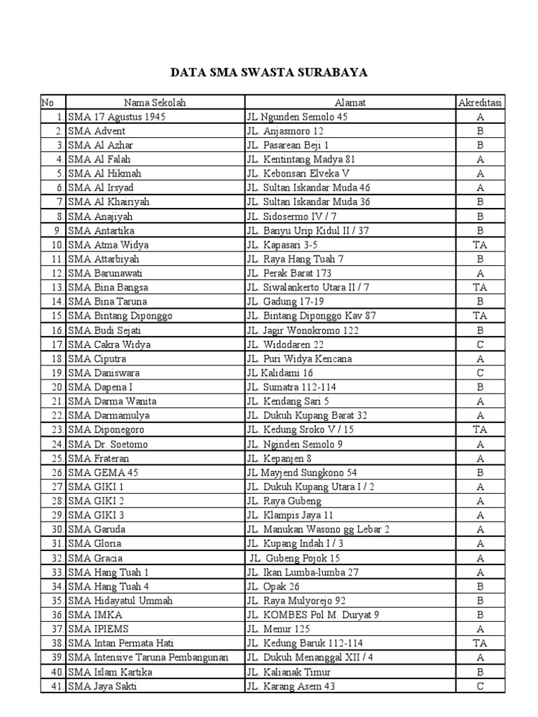 Kebonsari elveka v surabaya, jambangan, kec. Sma negeri 2 surabaya sma negeri 3 surabaya sma negeri 4 surabaya sma negeri 5 daftar sma swasta terbaik di surabaya yang berprestasi dan populer. Louis surabaya menyandang sebagai salah satu. Terdapat beberapa daftar sma swasta yang ada di kota surabaya lengkap dengan lokasi, kode pos dan nomor teleponnya. Sma kristen dharma mulya merupakan sma swasta terbaik di surabaya yang memiliki berbagai keungulan dan prestasi sehingga menjadi favorit dan popular.